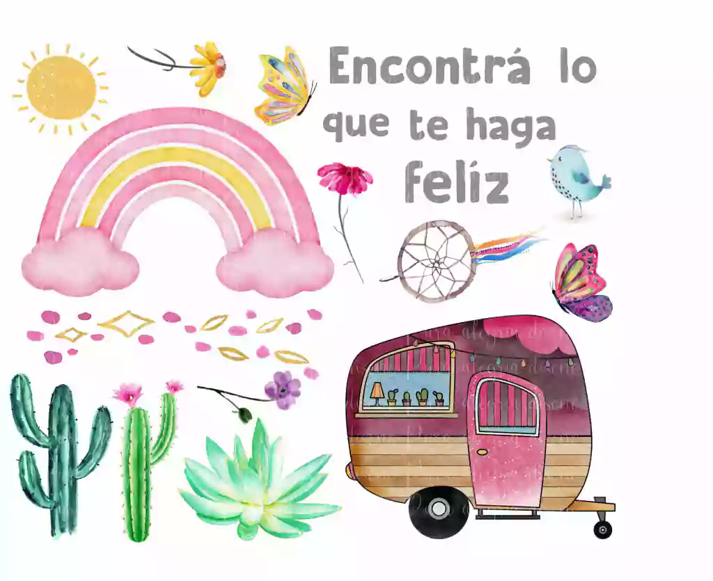 Tiene 19 estampas, el arcoiris mide 12,3 x 17,7 cm aprox y la casita rodante 10,7 x 9 cm aprox