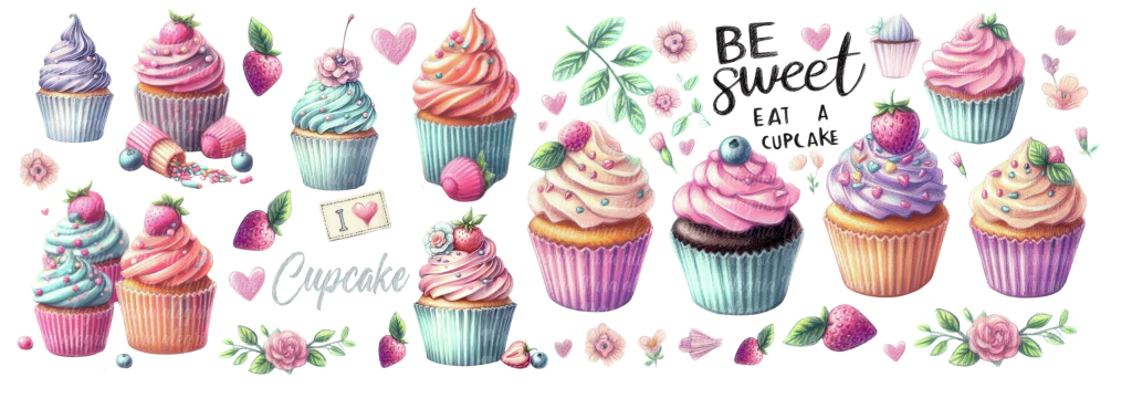 Tiene 12 cupcakes que miden entre 10,5 cm y 8 cm aprox. y muchas estampas mas chiquitas